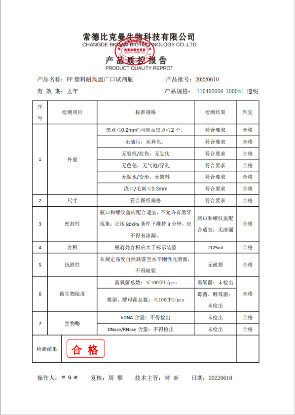 比克曼生物 PP塑料耐高溫廣口試劑瓶 1000ml 透明 110405056 20220610