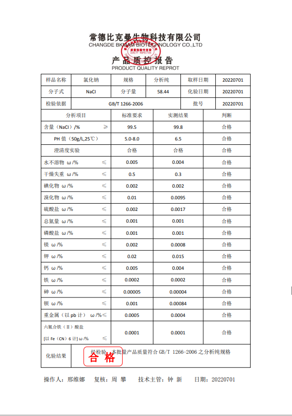比克曼生物 氯化鈉 AR 分析純 500g瓶 110702034 20220701