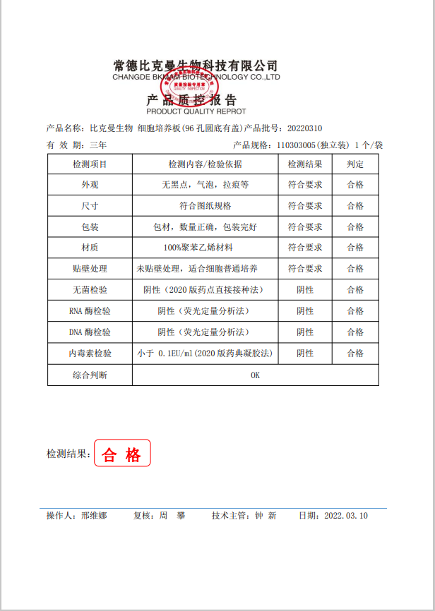 比克曼生物 細(xì)胞培養(yǎng)板(96孔圓底有蓋)(獨立裝) 1個培裝 110303005 20220310