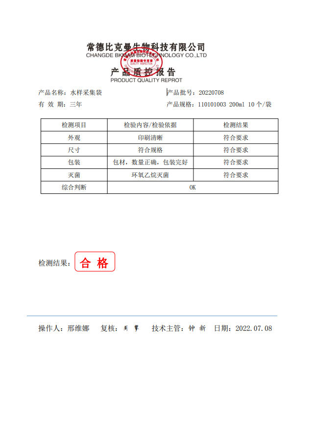 比克曼生物 水樣采集袋 200ml 10個(gè)袋 110101003 20220708