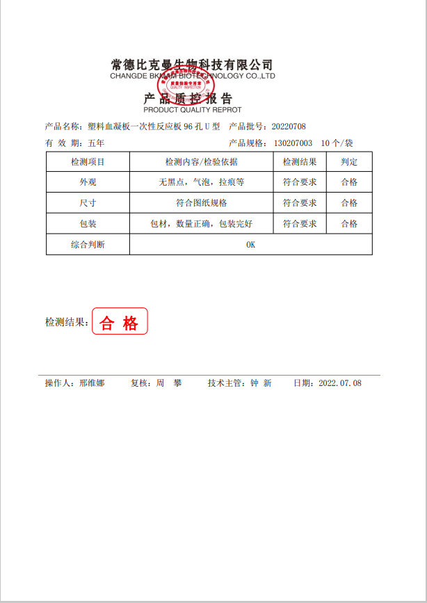 BKMAM 塑料血凝板一次性反應板96孔U型 10個裝 130207003 20220708