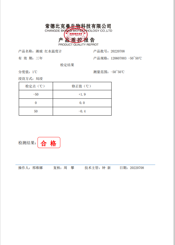 湘玻 紅水溫度計(jì) -50-50℃ 120607003 20220708