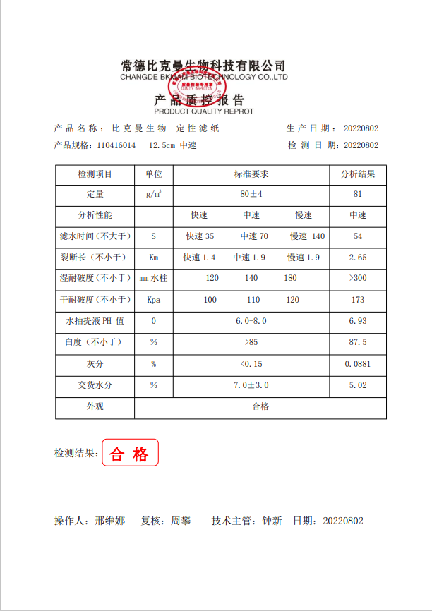 比克曼生物 定性濾紙12.5cm(中速) 100張盒 110416014 20220802