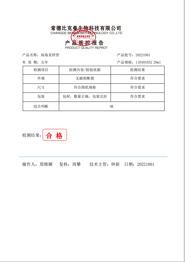 比克曼生物 病毒采樣管(棉蓋,不擰蓋,非滅菌) 20ml 110401032 20221001