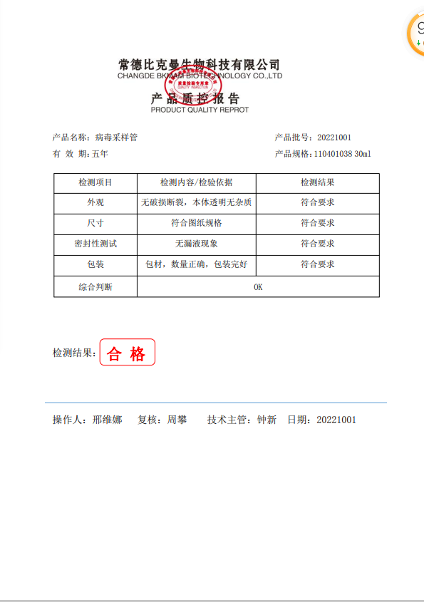 比克曼生物 病毒采樣管 30ml 110401038 20221001