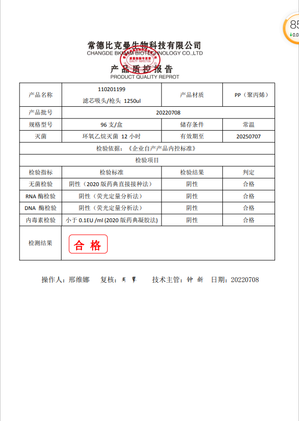 110201199 1250ul 濾芯吸頭槍頭 96支裝 20220708
