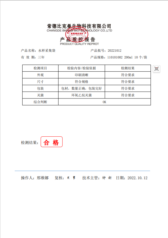 110101002 水樣采集袋 (含硫) 200ml 10個(gè)袋 20221012