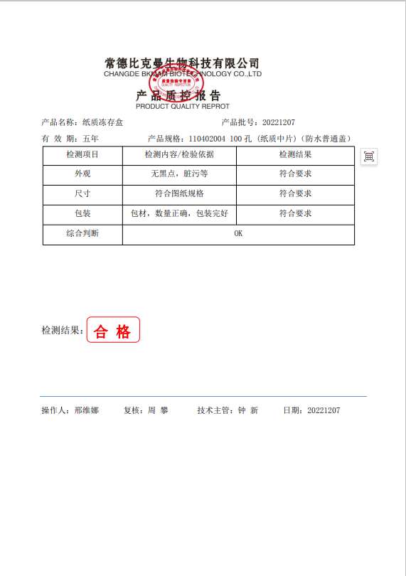 110402004 比克曼生物 100孔紙質(zhì)凍存盒(紙質(zhì)中片) (防水普通蓋) 20221207