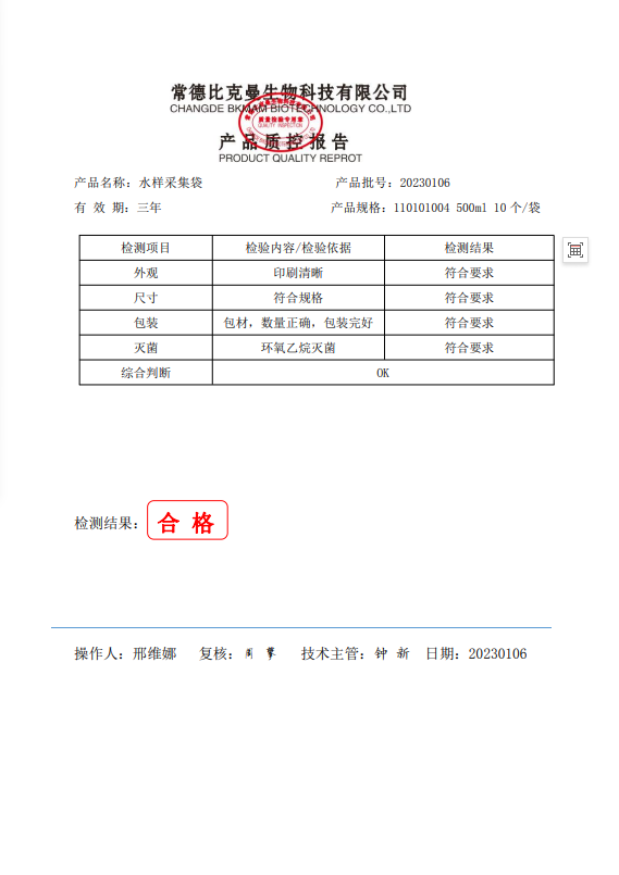 110101004 比克曼生物 水樣采集袋 (含硫) 500ml 10個袋 20230106