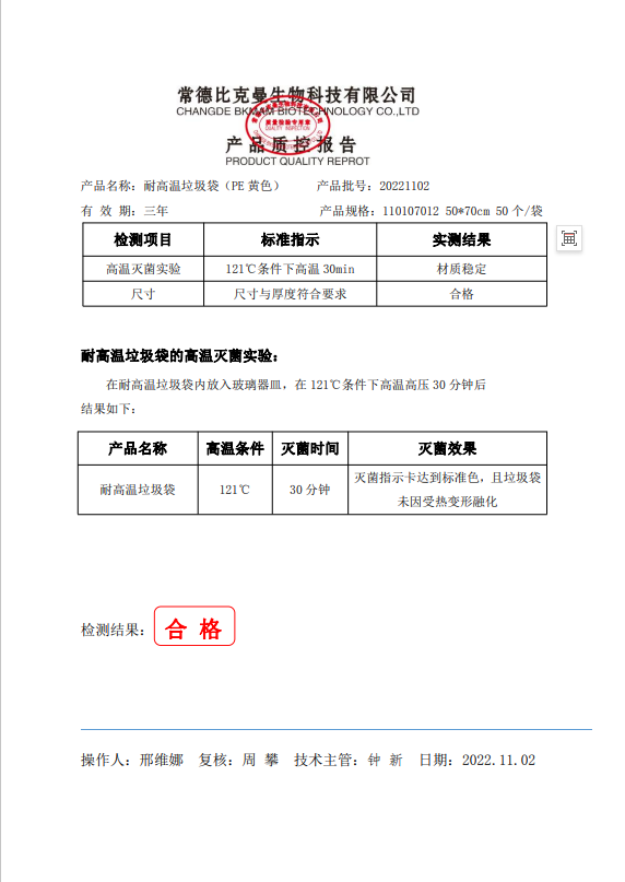 110107012 比克曼生物 耐高溫垃圾袋 黃色 50x70cm (PE復合膜材質) 50個袋 20221102