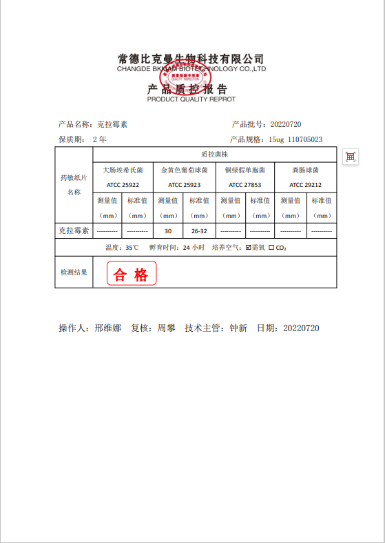 110705023 比克曼生物 克拉霉素 15ug 20片瓶 20220720