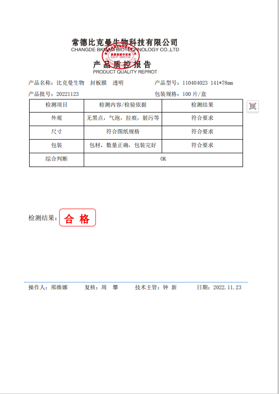 110404023 比克曼生物 熒光定量PCR封板膜 141x78mm 100片盒 20221123