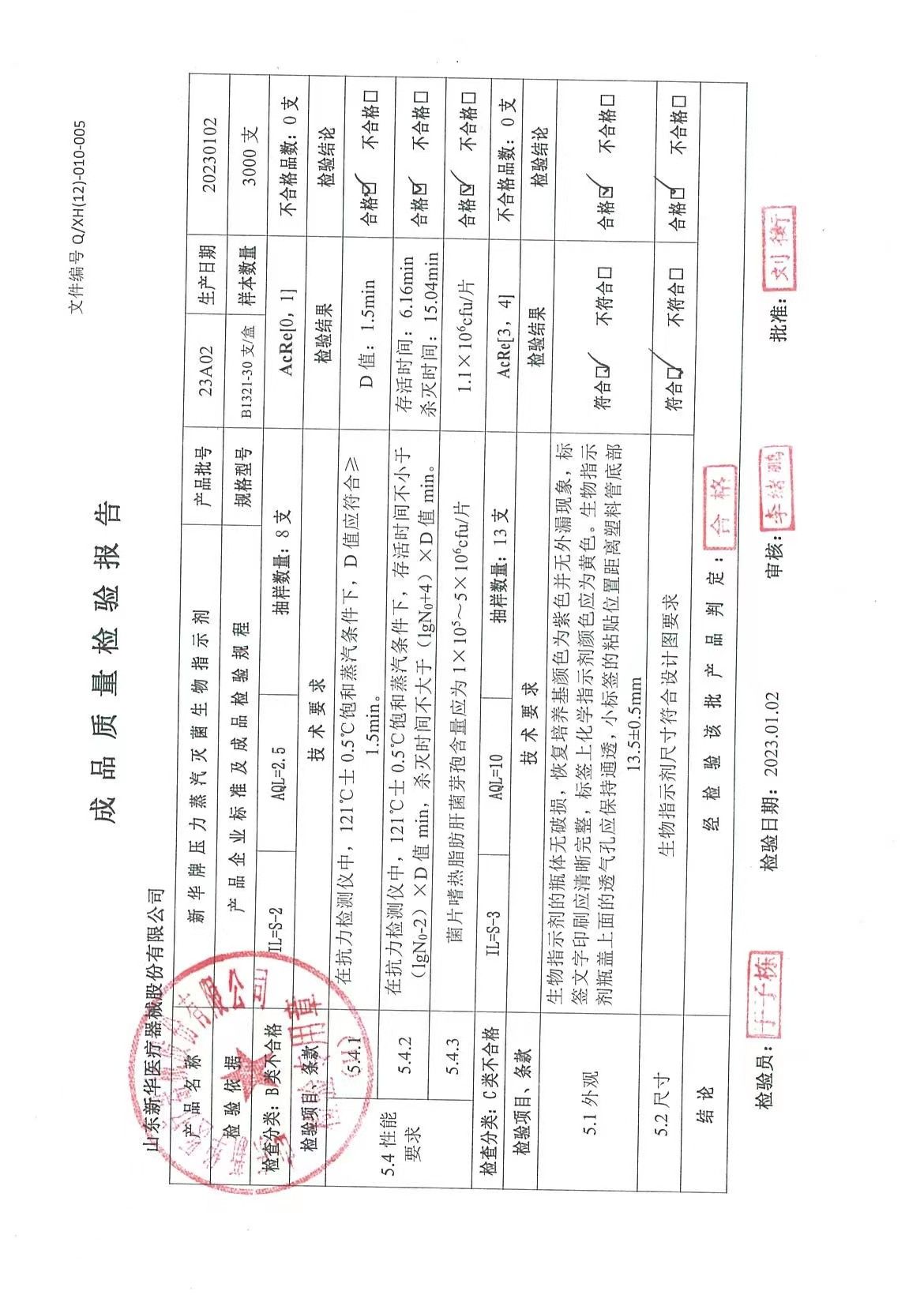 新華牌壓力蒸汽滅菌生物指示劑 B1321-50支盒 批號 23A02 生產日期 20230102