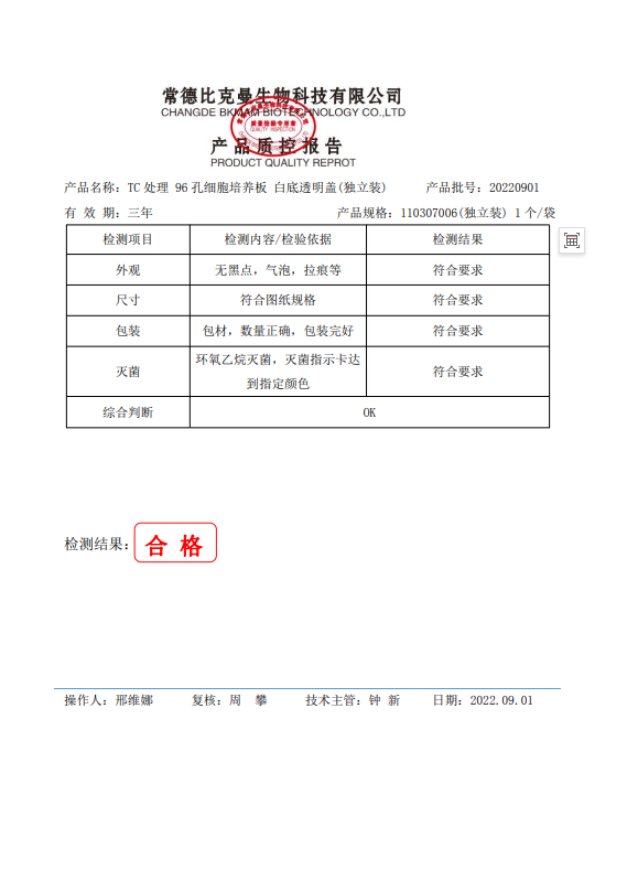 110307006 比克曼生物 TC處理 96孔細(xì)胞培養(yǎng)板 白底透明蓋 (獨(dú)立裝) 1個袋 20220901