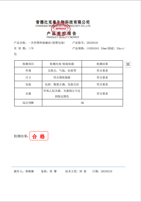 110301041 比克曼生物 一次性塑料接觸皿 (紙塑包裝) 55mm (弧底) 10個(gè)袋 20230310