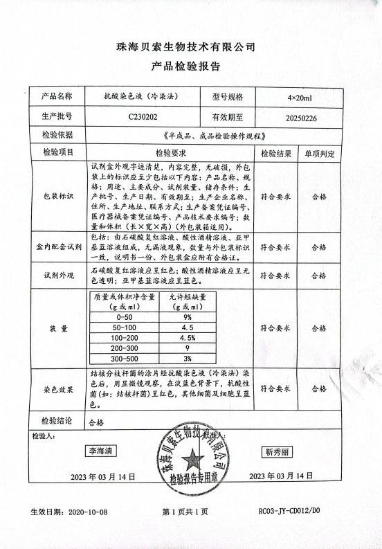 貝索 抗酸染色液(冷染法) 4x20ml C230202