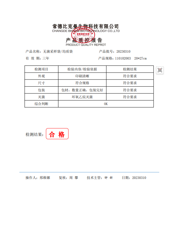 110102003 比克曼生物 立式無(wú)菌采樣袋 20x27 (帶壓條) 100個(gè)裝 20230310