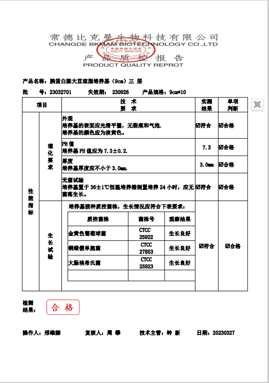 110704022 比克曼生物 胰蛋白胨大豆瓊脂(三層包裝) TSA瓊脂平板 9cm 10個(gè)袋 23032701