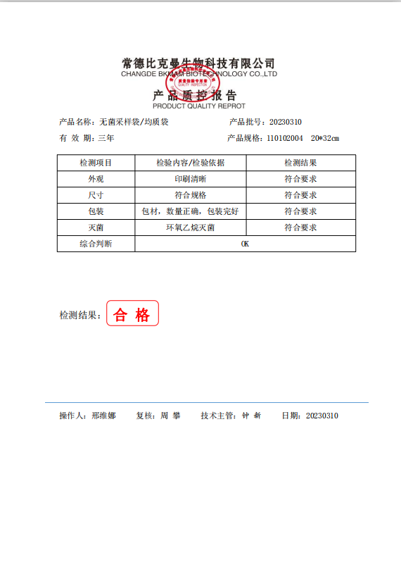 110102004 比克曼生物 立式無菌采樣袋 20x32(帶壓條) 100個裝 20230310