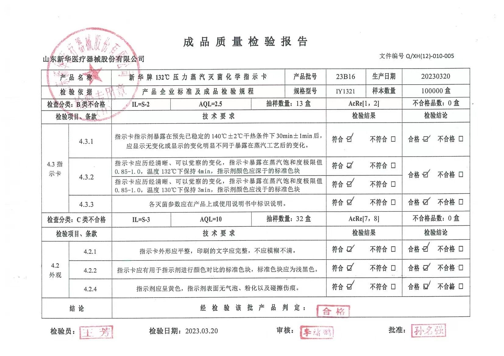 新華牌 121℃壓力蒸汽滅菌化學(xué)指示卡 I型 批號(hào)23B16 生產(chǎn)日期20230320