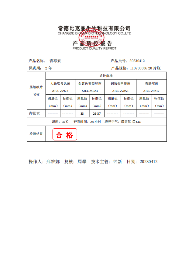 110705036 比克曼生物 青霉素 10UG 20片瓶 20230412
