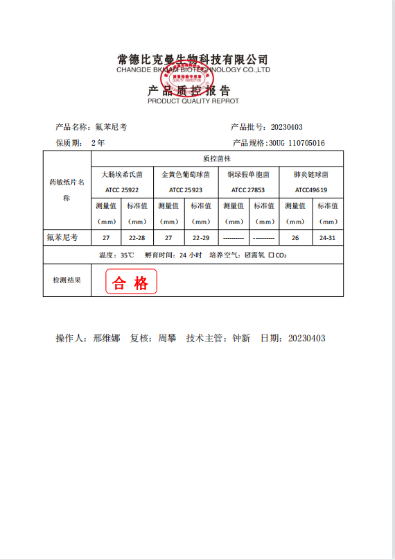 110705016 比克曼生物 氟苯尼考 30UG 20片瓶 20230403