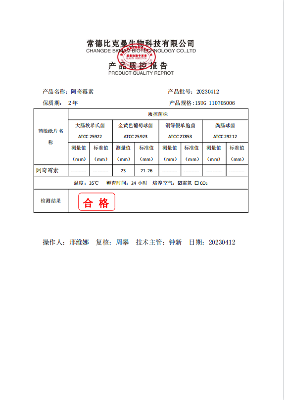 110705006 比克曼生物 阿奇霉素 15UG 20片瓶 20230412