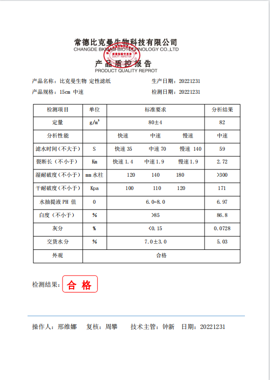110416011 比克曼生物 定性濾紙 15cm(中速) 100張盒 20221231