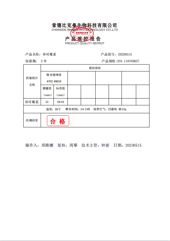 110705027 比克曼生物 林可霉素 2UG 20片瓶 20230515