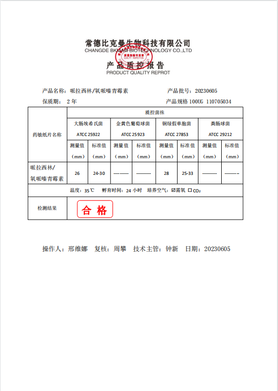 110705034 比克曼生物 哌拉西林 100UG 20片瓶 20230605