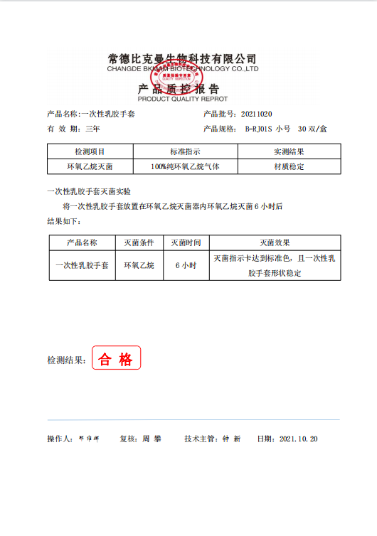 比克曼生物 一次性乳膠手套 小號 30雙盒 B-SR01S 20211020 滅菌報告