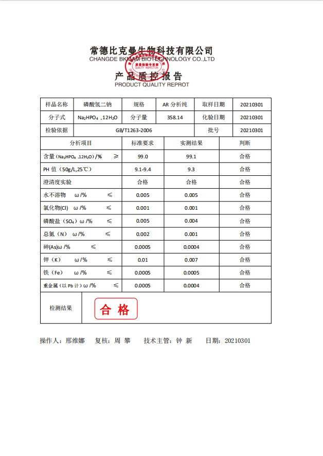 比克曼生物 磷酸氫二鈉 AR 分析純 500g瓶 110702021 20210301