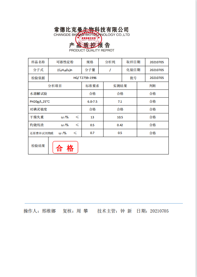 比克曼生物 可溶性淀粉 AR分析純 250g瓶 110702018 20210705