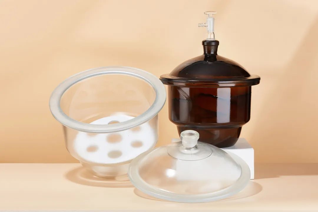 玻璃真空干燥器是一種具有寬邊磨砂蓋的密封容器。其底座下半截為縮細(xì)的腰,內(nèi)壁有一寬邊,用以擱置瓷板。瓷板具有大小不同的孔洞,上面可放置被干燥的物質(zhì),瓷板下部底座用以存放干燥劑。它可以通過抽真空的方式,與干燥劑同時(shí)作用,加速樣品中的水分蒸發(fā),以便長(zhǎng)期保存或進(jìn)行分析,為實(shí)驗(yàn)室樣品干燥和保存的重要設(shè)備。