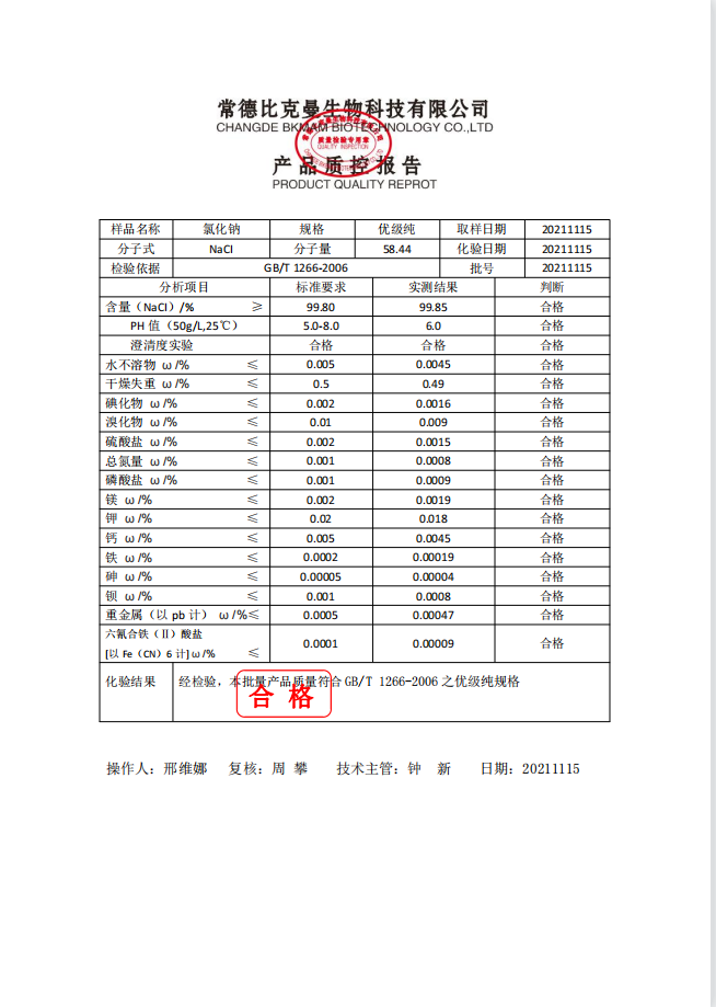 比克曼生物 氯化鈉 GR 優(yōu)級純 500g瓶 110702035 20211115