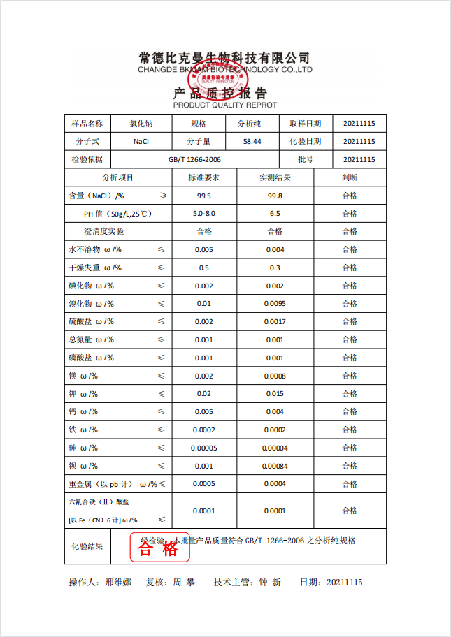 比克曼生物 氯化鈉 AR 分析純 500g瓶 110702034 20211115