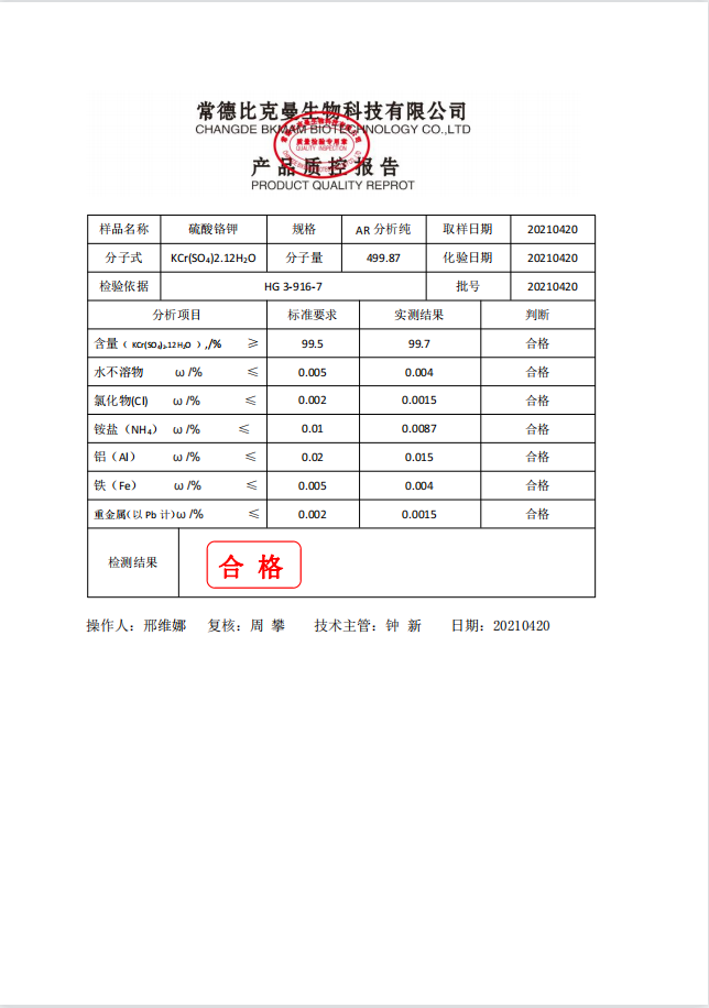 比克曼生物 硫酸鉻鉀 AR分析純 500g瓶 110702024 20210420