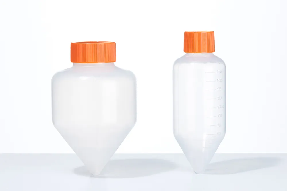 大體積樣本離心瓶 離心瓶用于大體積樣本的處理,瓶身側面有刻度凸起。離心瓶清潔后可重復使用。使用離心瓶是一定需要大型臺式離心機或立式離心機的。