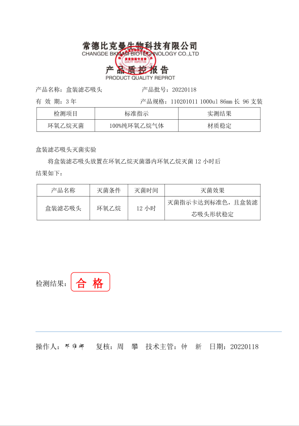 盒裝濾芯吸頭 1000ul 盒裝濾芯吸頭 86mm 96支裝 110201011 20220128 滅菌報告