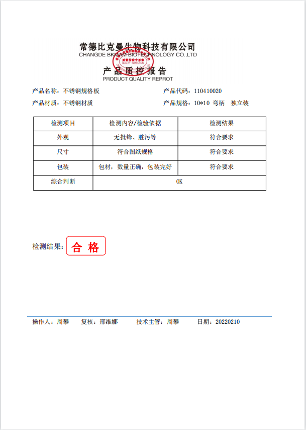 比克曼生物 不銹鋼規(guī)格板 10x10 彎柄 獨(dú)立裝 110410020 20220210