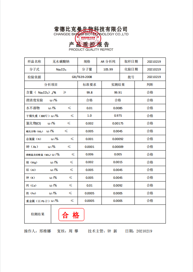 比克曼生物 無水碳酸鈉 AR分析純 500g瓶 110702055 20210219