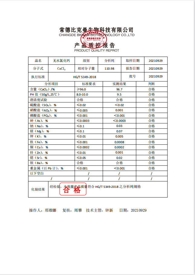 比克曼生物 無水氯化鈣 250g瓶 110702052 20210929