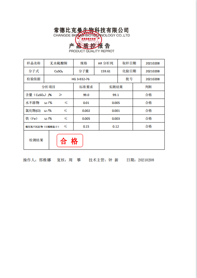 比克曼生物 無水硫酸銅 AR 分析純 500g瓶 110702051 20210208