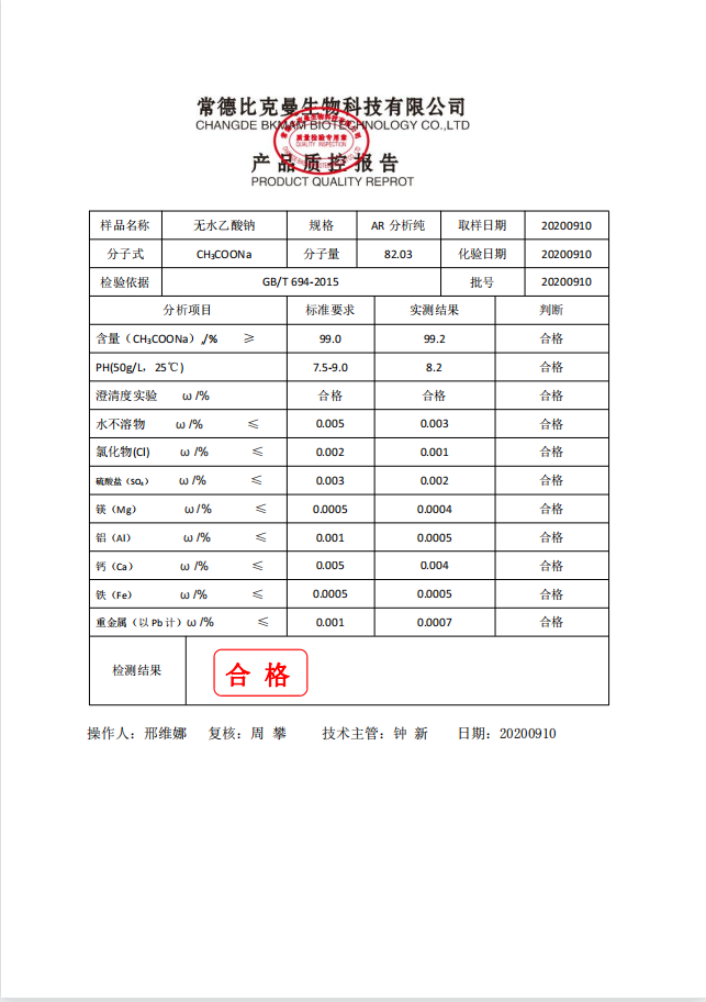 比克曼生物 無(wú)水乙酸鈉 AR分析純 250g瓶 110702057 20200910