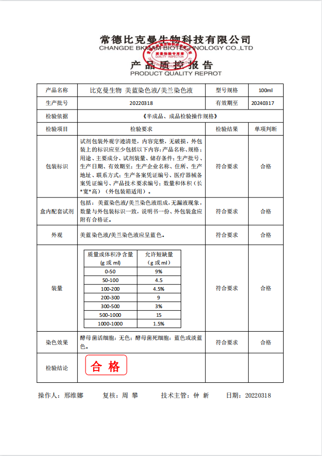 比克曼生物 美藍(lán)染色液(美蘭染色液) 100ml瓶 110703021 20220318