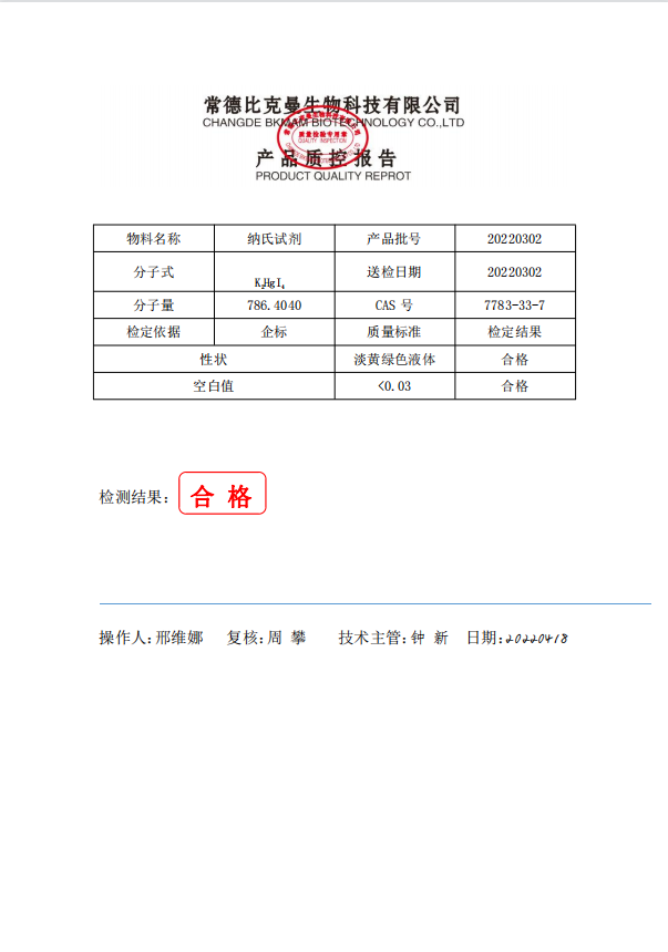 比克曼生物 納氏試劑 500ml 瓶 110702071 20220302